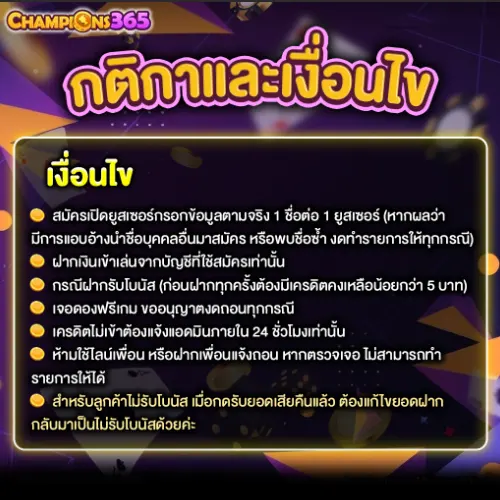 เว็บพนัน Champions365 - แหล่งรวมความบันเทิงด้านการเดิมพันออนไลน์ครบวงจร ที่เปิดให้บริการตลอด 24 ชั่วโมง พร้อมระบบฝาก-ถอนอัตโนมัติที่รวดเร็วภายใน 30 วินาที มาพร้อมเกมพนันหลากหลายรูปแบบ ทั้งกีฬา คาสิโน สล็อต และหวย ด้วยมาตรฐานระดับสากลและระบบความปลอดภัยขั้นสูง ทำให้สมาชิกสามารถเพลิดเพลินกับการเดิมพันได้อย่างไร้กังวล นอกจากนี้ยังมีโปรโมชั่นพิเศษมากมายสำหรับทั้งสมาชิกใหม่และสมาชิกเก่า พร้อมทีมงานคอยให้บริการและช่วยเหลือตลอดเวลา ทำให้ Champions365 เป็นจุดหมายปลายทางสำหรับนักเดิมพันที่ต้องการประสบการณ์การเล่นเกมออนไลน์ที่ครบครันและน่าเชื่อถือ